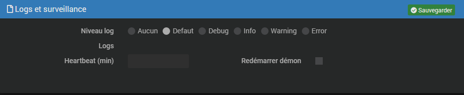 Heartbeat : Toute les 5 mins, Jeedom regarde si au moins un équipement du plugin a communiqué dans les X dernières minutes (si vous voulez désactiver la fonctionnalité, il suffit de mettre 0).