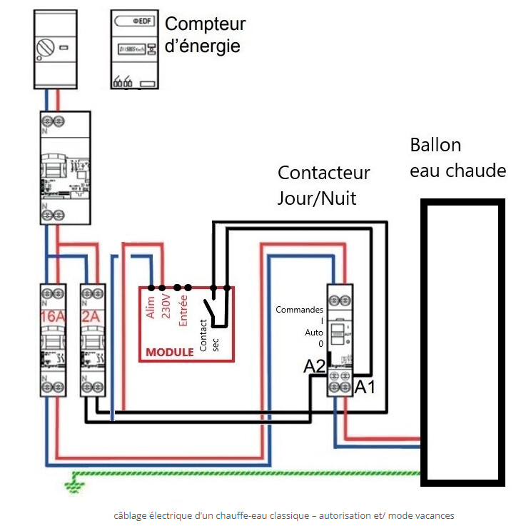 Effectivement, avant de poster, j’ai regardé et regarde ce qui se dit sur le forum. Je me suis arrêté sur ce schéma plusieurs fois utilisés sur le forum mais après avoir correctement cablé le tout, mon 2A disjoncte lors de l’envoie du signal EDF donc je pose la question