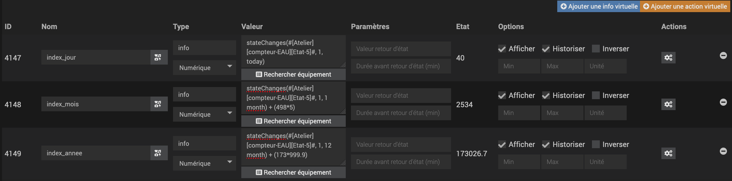 Avec un compteur à 1 impulsion = 0.25L, je pensais ajouter dans la formule *0.25 pour avoir le nombre de L, puis *0.001 dans la foulée pour convertir en m3.