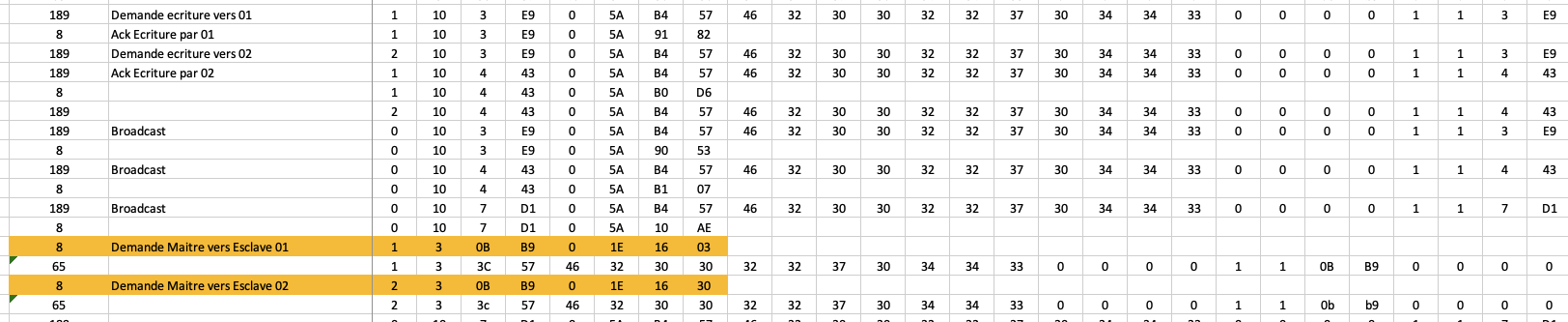 Lorsqu’on reçoit les datas correspondantes (Broadcast, ou écoute des échanges avec l’IHM), on les recopie dans le bon tableau, exemple :