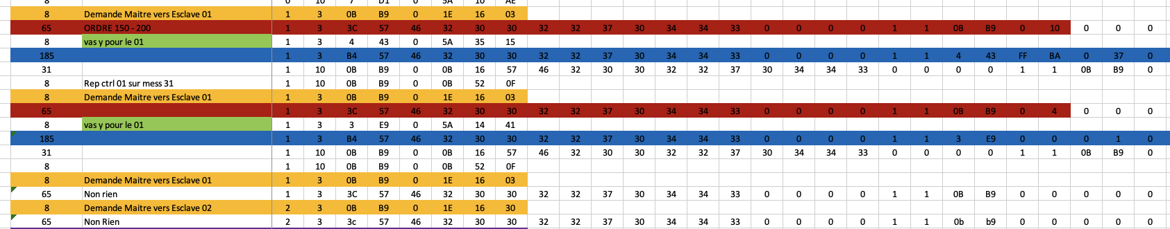 Je pense que c’est ce qu’il y a de plus simple, il y a un tableau par adresse (A ce propos, les adresses 07 D1 et 04 43 se chevauchent du au nombre de datas, mais les datas ne sont pas du tout les même à ce niveau, ce n’est donc pas du Modbus classiquement implémenté, pas d’accès mémoire direct, il y a du traitement entre deux), et j’ai aussi multiplié cela par deux pour les essais, un jeu de tableaux de recopie de ce qu’on voit passer vers et depuis l’IHM, et nos tableaux, identiques, cela donne donc les tableaux suivants (Je dois mettre ça au propre) :