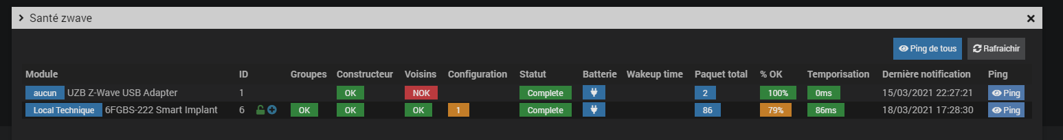 → Je fais une synchro (synchroniser dans le menu gestion du plugin zwave)