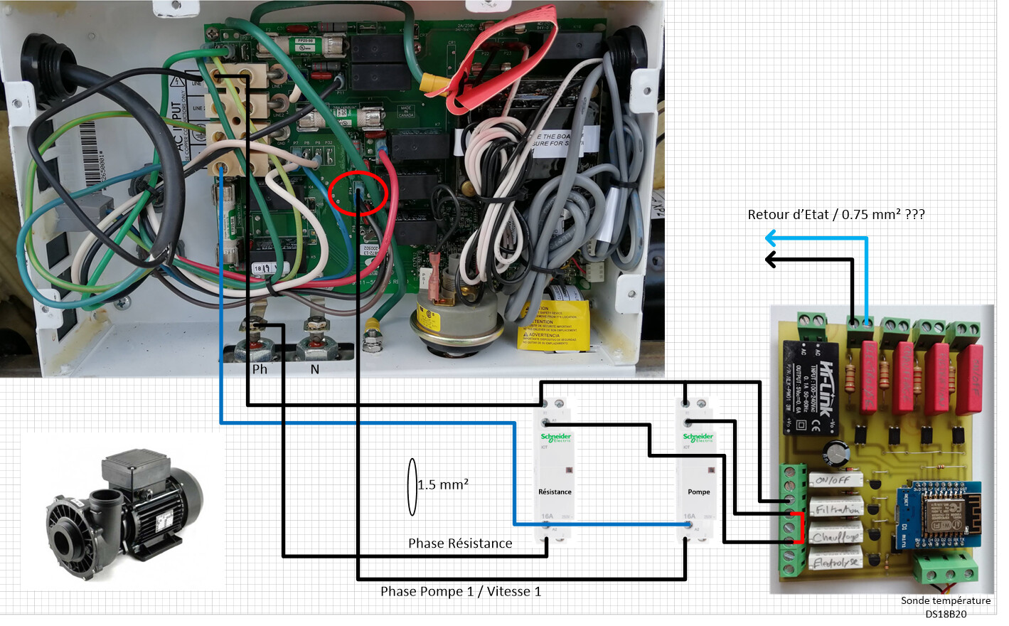 Je souhaite donc pouvoir mettre en route la pompe 1 en vitesse basse et ensuite la résistance électrique. Une sonde de température DS18B20 relièe à la carte et placée dans le spa permettra de gérer la consigne et l’arrêt ou le redémarrage de la résistance.