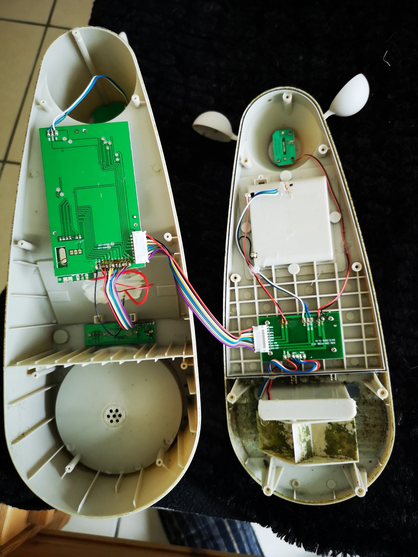 Pour le capteur de pluie, on voit le godet qui bascule et doit faire un contact (ou deux, on dirait qu’il y a trois fils). A tester en continuité au multimètre. Avec un pulse counter on doit y arriver.