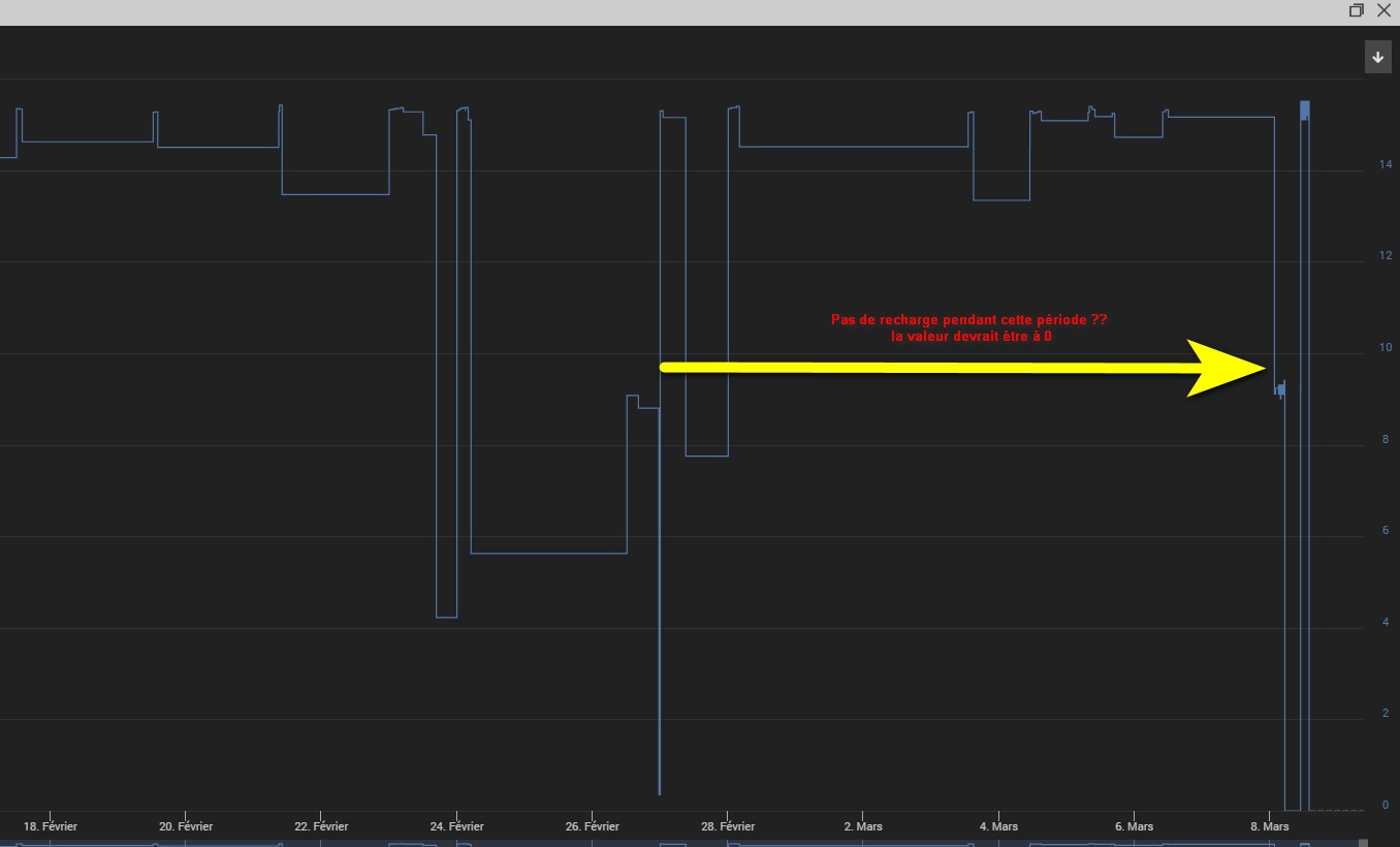 Cependant je n’explique pas ces périodes de plusieurs jours durant lesquelles un courant de charge est détecté alors que je n’ai pas branché mon véhicule. (voir fichier jeedom4.jpg)