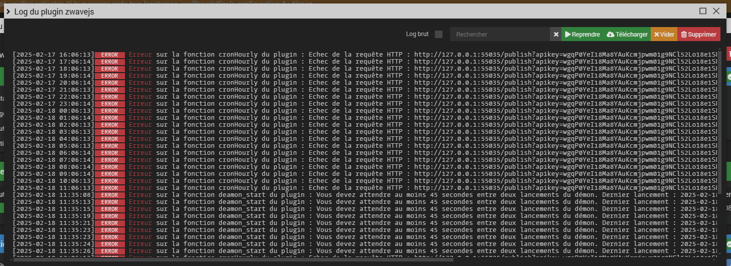 [2025-02-18 11:35:15] ERROR Erreur sur la fonction deamon_start du plugin : Vous devez attendre au moins 45 secondes entre deux lancements du démon. Dernier lancement : 2025-02-18 11:35:03