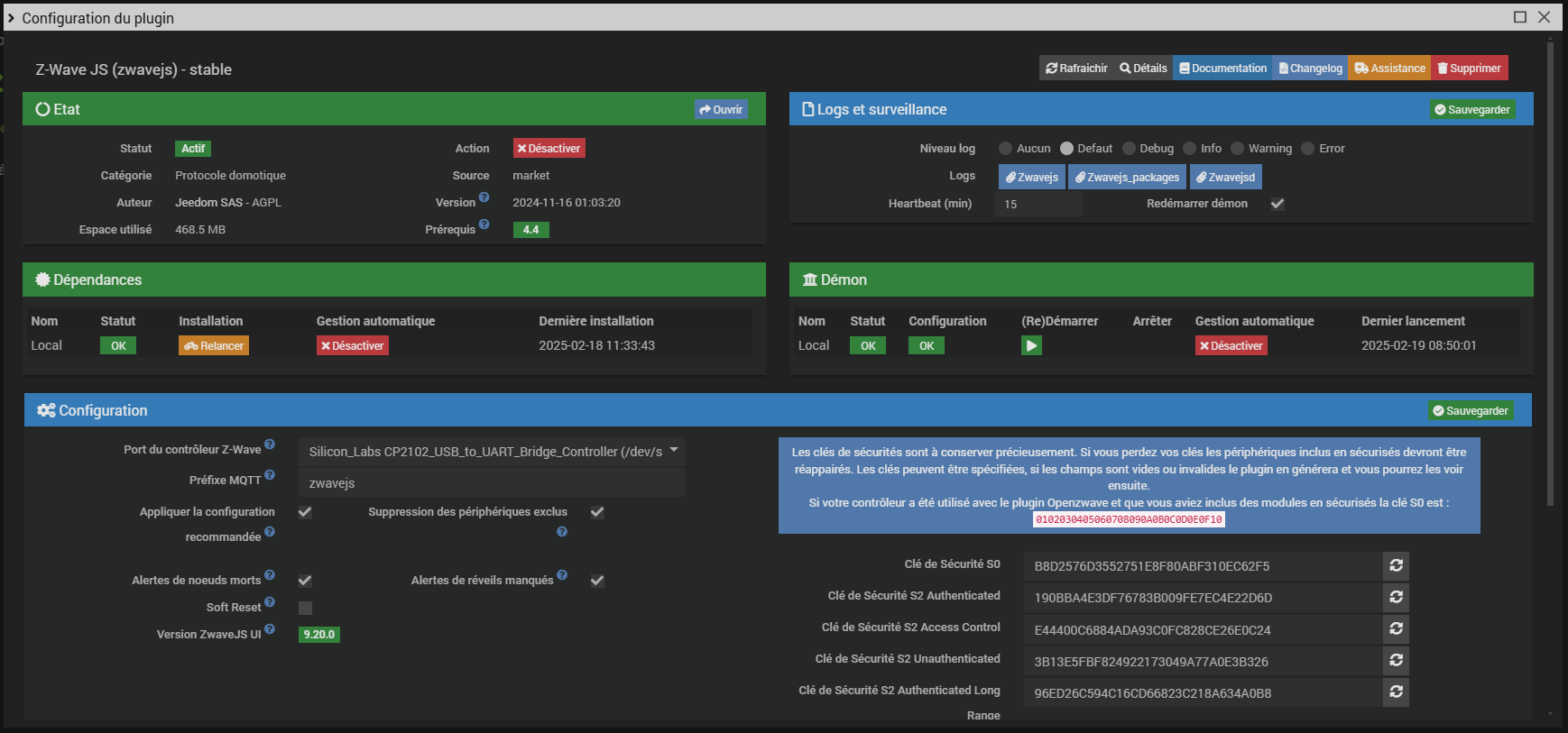 [2025-02-18 14:02:19] INFO Info sur le démon : {"log":"zwavejs","launchable":"ok","state":"nok","launchable_message":"Gestion automatique d\u00e9sactiv\u00e9e","auto":"0","last_launch":"2025-02-18 14:00:02"}