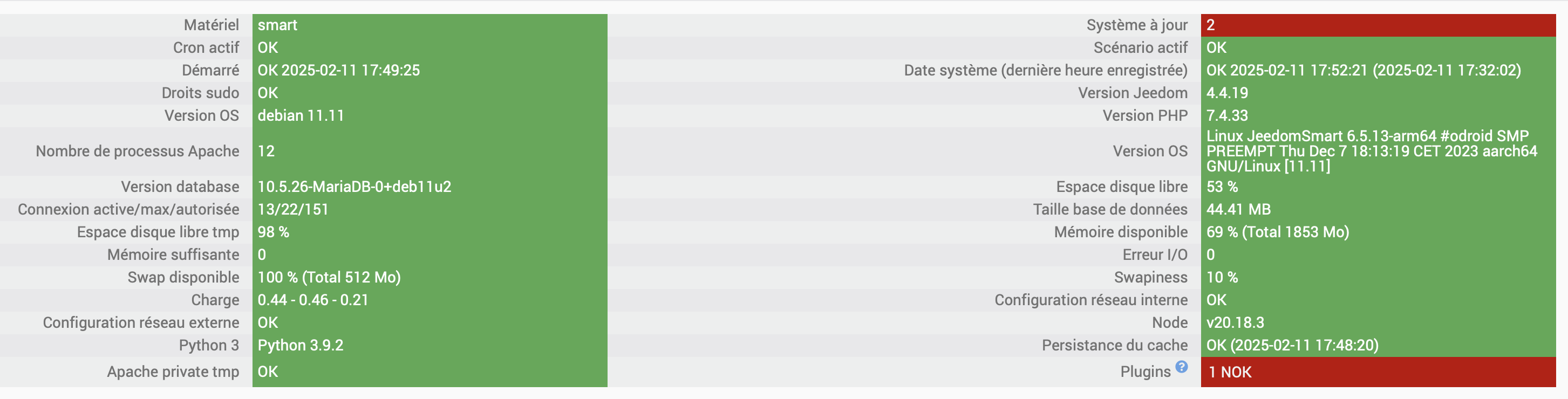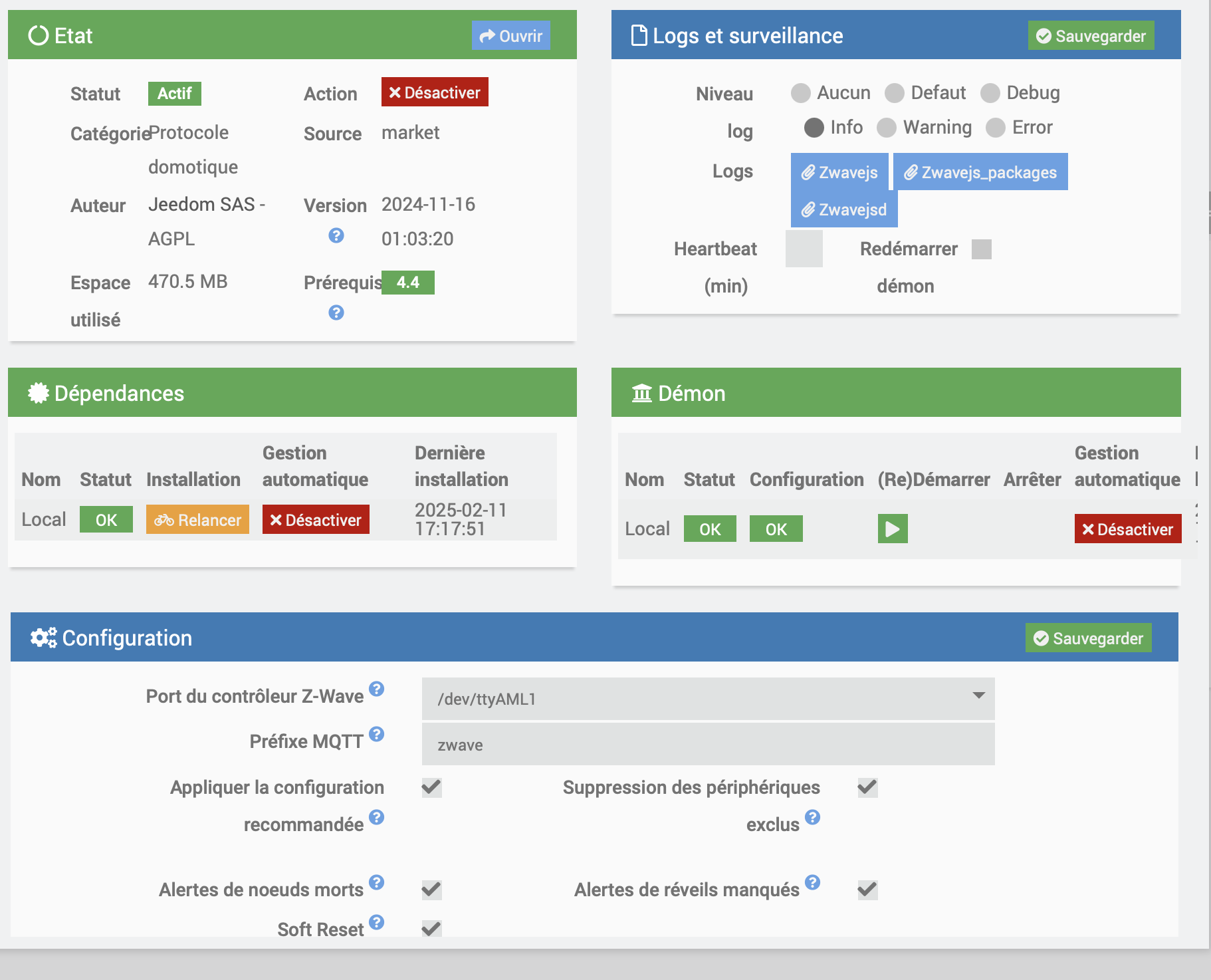 Bonjour, le vient de changer la puce de ma box smart pour passer en Debian 11 et malheureusement cela ne fonctionne pas comme prévu. En dehors du fait que ma clef bluetooth décroche et nécessite de débrancher/rebrancher la clef j’ai un souci avec mon plugin Zwavejs qui ne commande plus rien. Le plugin est a jour j’ai relancé les dépendances, changé de port mais rien n’y fait, et ce message persiste : message : « Le driver Z-Wave n'est pas initialisé, veuillez patienter. Si le message reste trop longtemps, veuillez vérifier la configuration du démon »