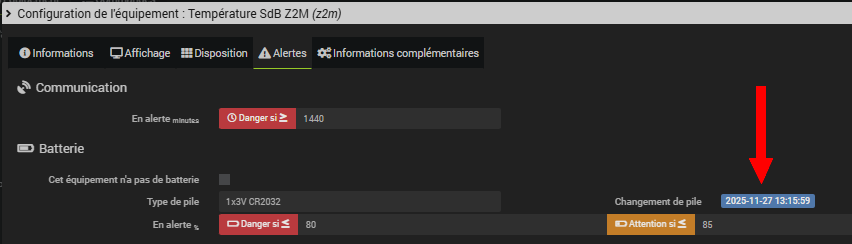 Si vous avez quelque part un listing avec les dates de changement de piles, il est possible de les rétablir avec un scénario. C’est fastidieux car prévu pour corriger si je me trompais d’équipement ou si je remettais les anciennes piles en place.
