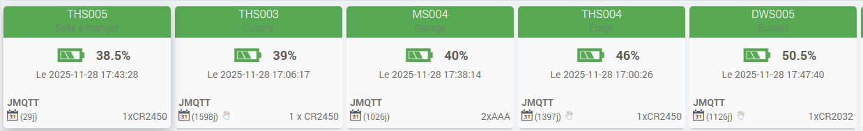 Effectivement, le seuil se trouve quelque part entre 87% et 92%. Pour les équipements qui n’ont pas communiqué tout de suite, la date de changement de pile correspond à leur retour dans la liste.