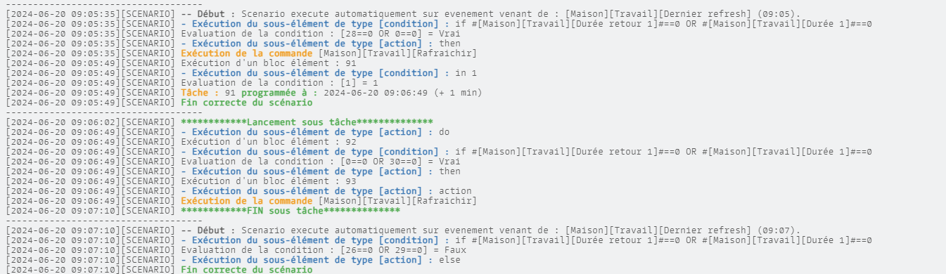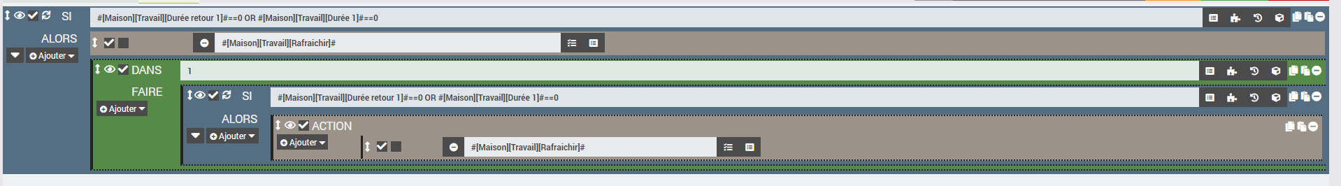 Idem, trajet retour OK, trajet aller vide. J’ai remarqué que les commandes « Trajet retour 1 & 2 » étaient renseignés, mais les commandes « Trajet 1 & 2 » étaient à NA. J’ai juste copié la valeur de « Trajet retour 1 » dans « Trajet 2 » et « Trajet retour 2 » dans « Trajet 1 ». J’ai rafraichi et j’ai les temps pour l’aller et le retour. Donc en attendant un fixe, je lance le scénario qui copie les valeurs du retour vers l’aller.