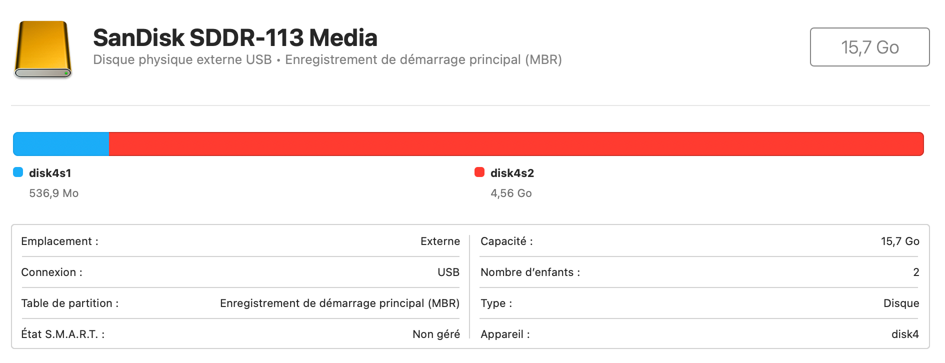 En utilisant l’adaptateur EMMC je remarque que la partition n’est pas lisible sur mon Mac alors que la 8Go est totalement accessible.