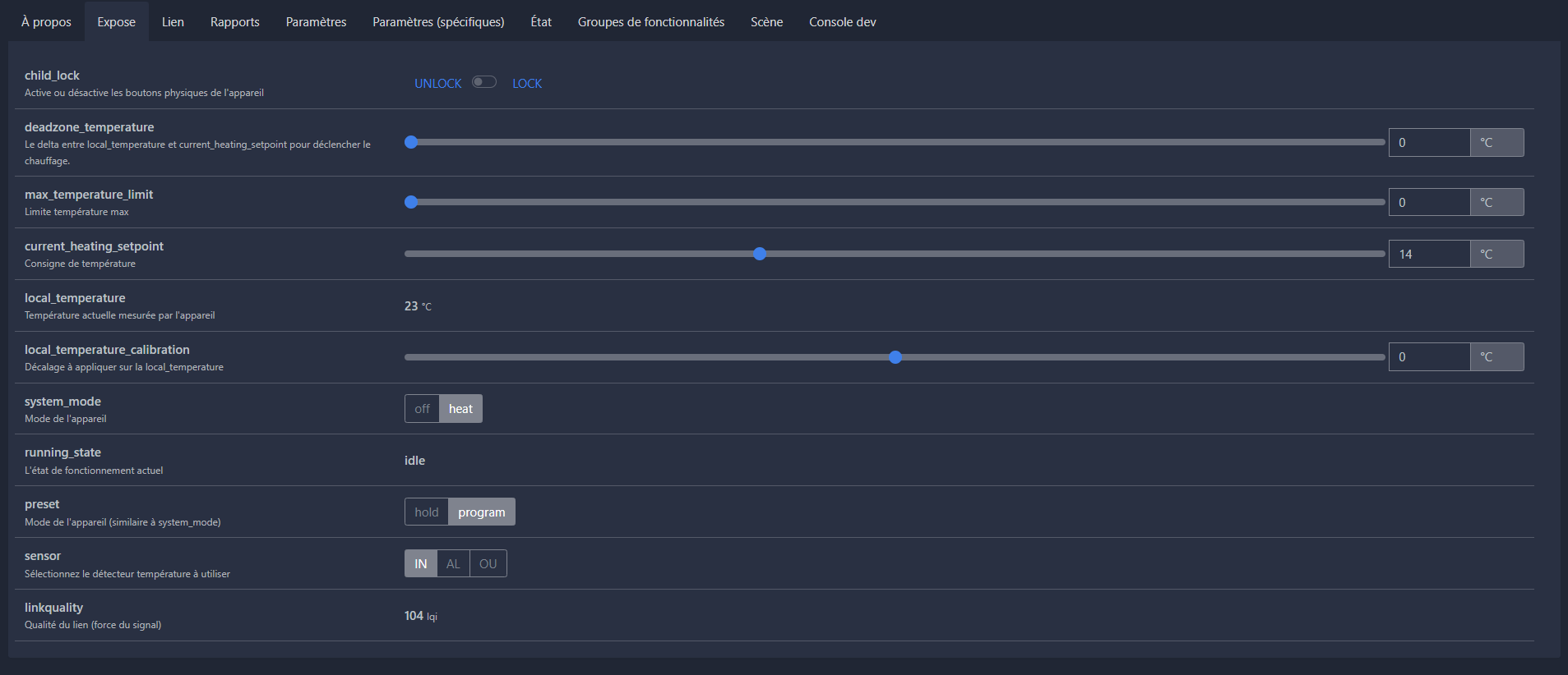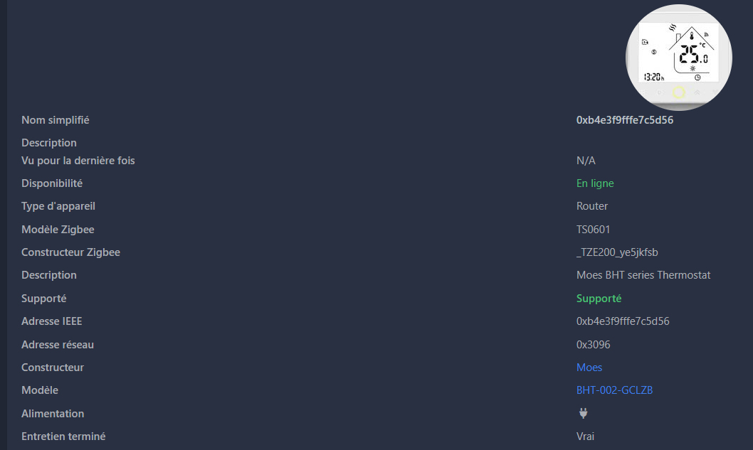 Le thermostat est parfaitement reconnu par zigbee2mqtt avec la clef POPPS : remontée de t°, changement de consigne, etc… mais pas avec la clef sonoff qui n’est pas affichée comme expérimentale.