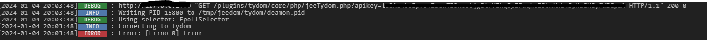 depuis quelques jours j’ai une erreur sur le plugin Tydom (bêta), aucune erreur sur la santé de jeedom ci dessous le log, avez vous une idée ?