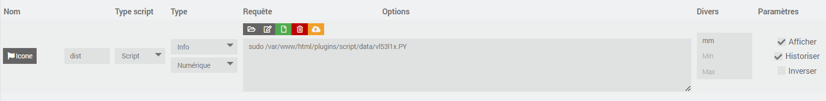 et le paramètres dans jeedom (requete : sudo /var/www/html/plugins/script/data/vl53l1x.PY )