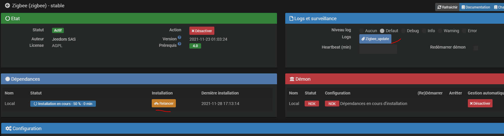 Ha oui merci, comme ce n’est pas indiqué pareille que dans d’autres plugins je n’avais pas fais attention c’est sur la première ligne « Launch install of zigbee dependancy » et comme il y a quelque warning je le mets ici.