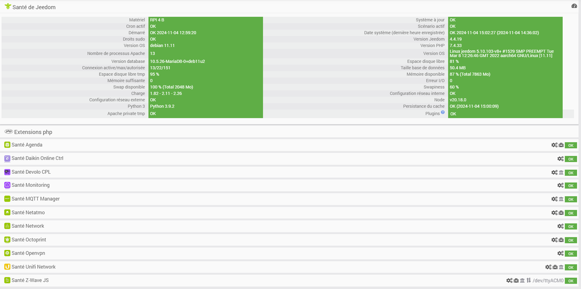 Santé du Jeedom: tout à vert