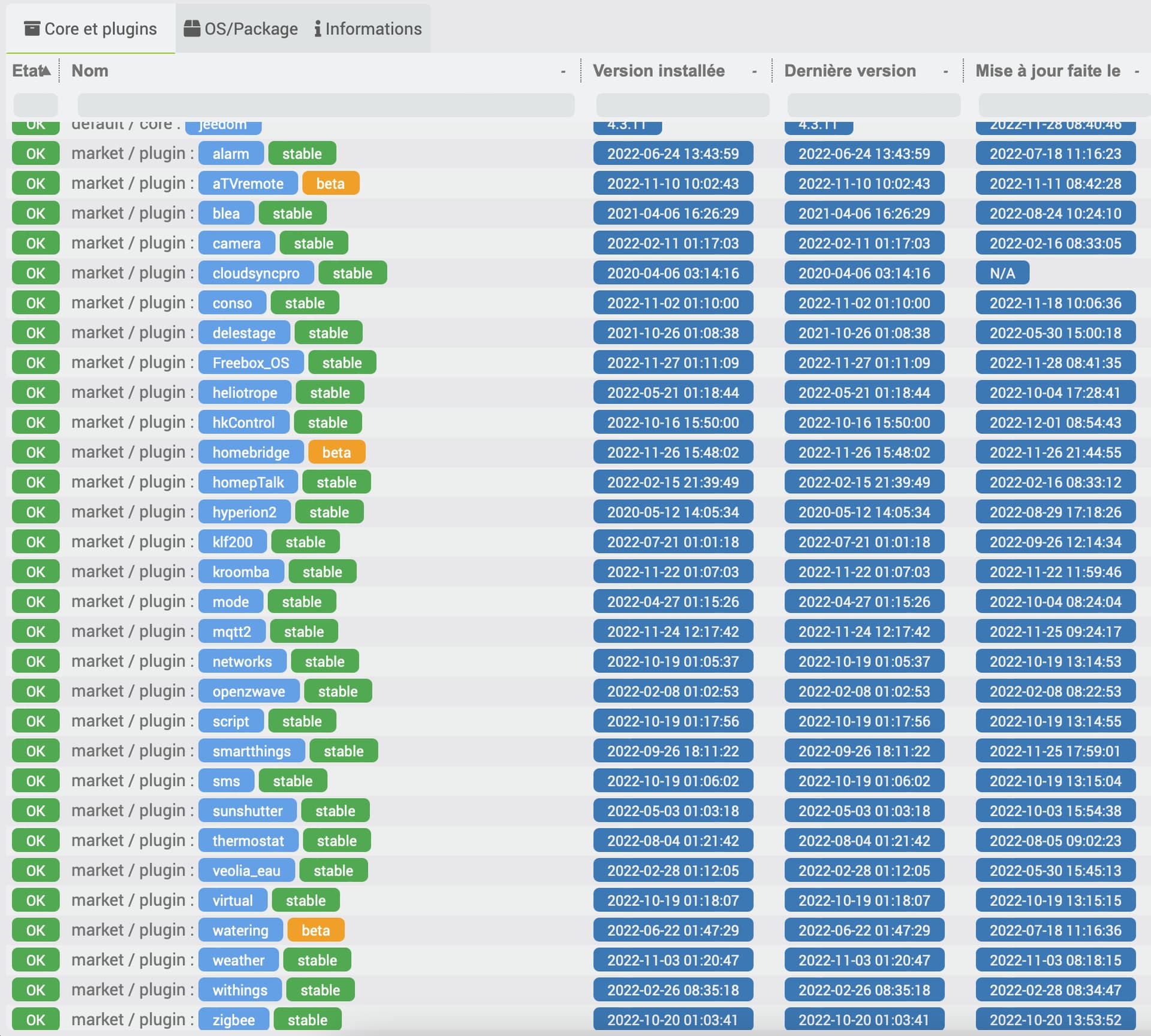 Je comprends qu’en l’absence de log c’est compliqué à debugger lol mais j’avoue que j’ai pas remarqué d’anomalie sur tout le reste du système pourtant j’en utilise des plugins lol Peut etre qu’une autre dépendance ou mise à jour d’une autre app a fait planter celui ci, ca arrive, voila tous mes plugin et version (tous sont à jours) :