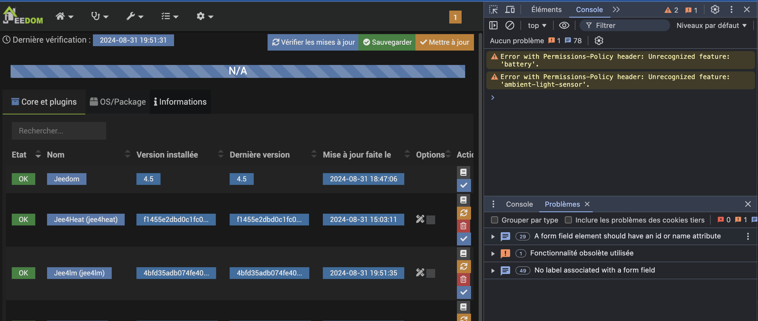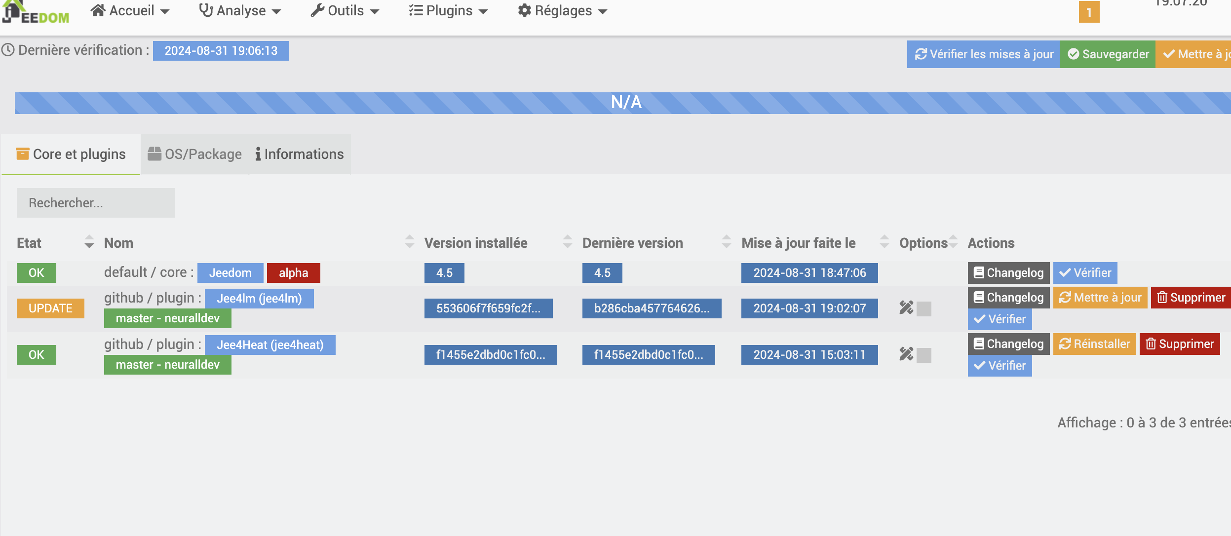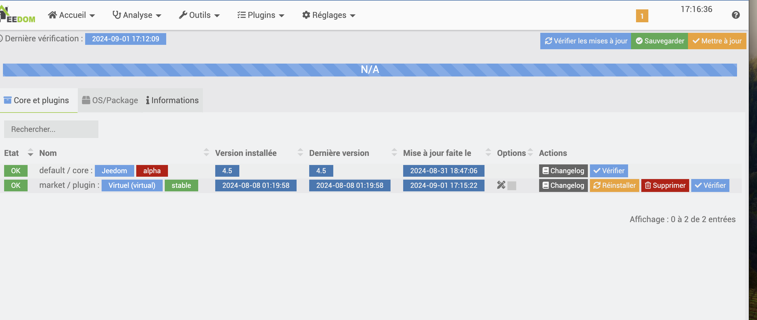 http error log est vide, la fenêtre de progression reste bloquée avec marquéer N/A, pour autant les mises à jour se font bien, car si on rafraichit à la main la page ça affiche bien le plugin mis à jour