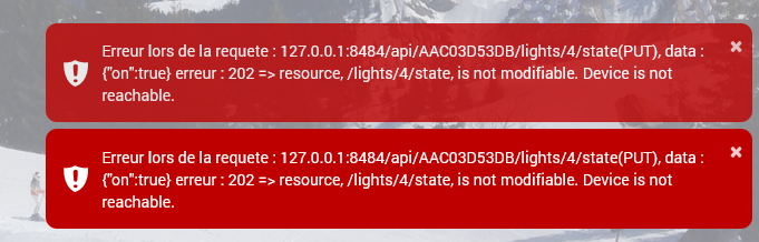 [2023-11-24 21:51:57][ERROR] : Erreur exécution de la commande [conbee_2][Bureau plafond][On 01] : Erreur lors de la requete : 127.0.0.1:8484/api/AAC03D53DB/lights/4/state(PUT), data : {"on":true} erreur : 202 => resource, /lights/4/state, is not modifiable. Device is not reachable.