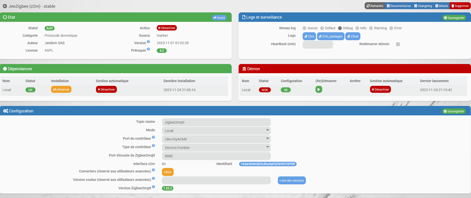 jeedom à jour, le core idem, à preciser que je suis sous deconz de base sur mon RPI principale et que je l’ai desactivé mais pas desinstallé. (j’attends que jeezigbee fonctionne avant de le desinstaller si besoin) donc est ce que le fait qu’il soit toujours installé pose soucis ? bonne question .