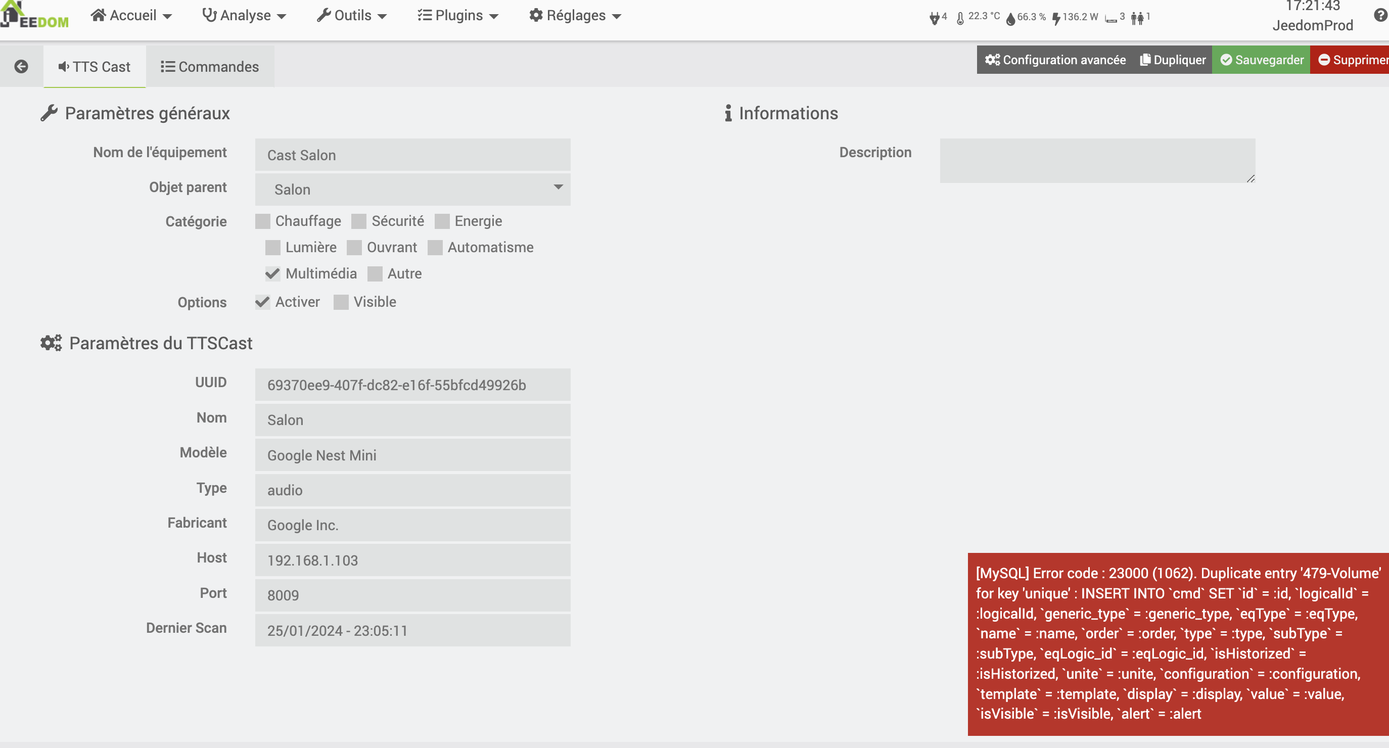 Si l’erreur n’est que sur la commande volume, il faudrait la supprimer cette commande (ou mieux supprimer l’équipement correspondant !), et sauvegarder deux fois (si juste commande supprimée) ou relancer un scan (si équipement supprimé), comme ca, ca va recréer les commandes manquantes ou bien qui ont changé.