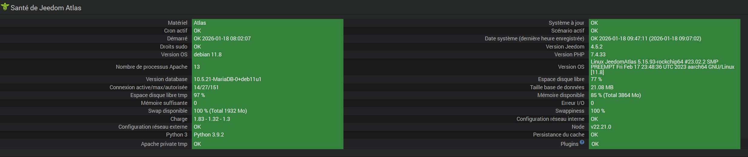 Le bilan santé de Jeedom est néanmoins plutôt correct :