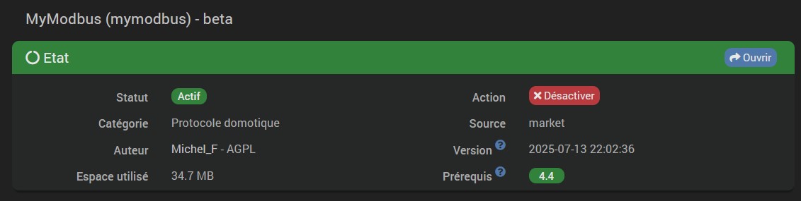 Ma version du plugin Mymodbus est la version Beta du 12/01/2026.