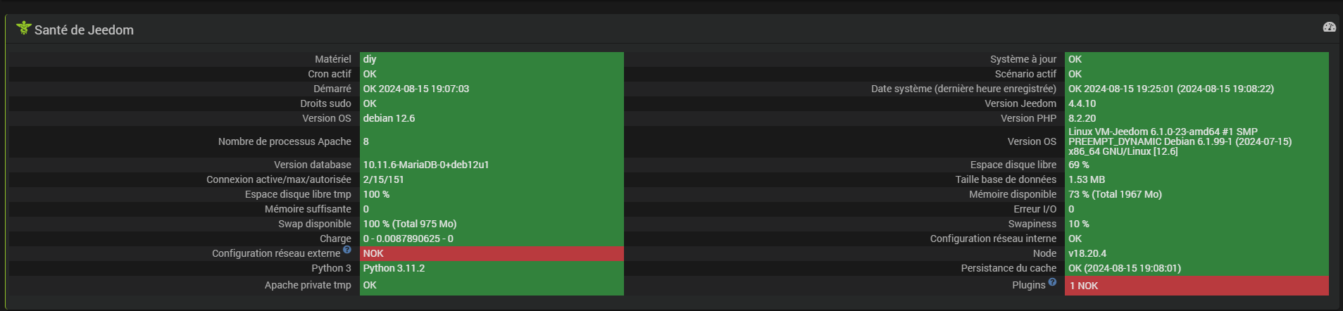 0000|[2024-08-15 19:18:32] INFO : Démarrage du démon Broadlink : /var/www/html/core/class/../../plugins/broadlink/resources/python_venv/bin/python3 /var/www/html/plugins/broadlink/resources/broadlinkd/broadlinkd.py --loglevel debug --socketport 55013 --sockethost 127.0.0.1 --callback http://127.0.0.1:80/plugins/broadlink/core/php/jeeBroadlink.php --apikey SuiydyUz02pDELHODw1bXsMi8cmeoisdLxx1X16Vq80sQqNFHBbiI4P78c6GWU0m --cycle 0.3 --pid /tmp/jeedom/broadlink/deamon.pid