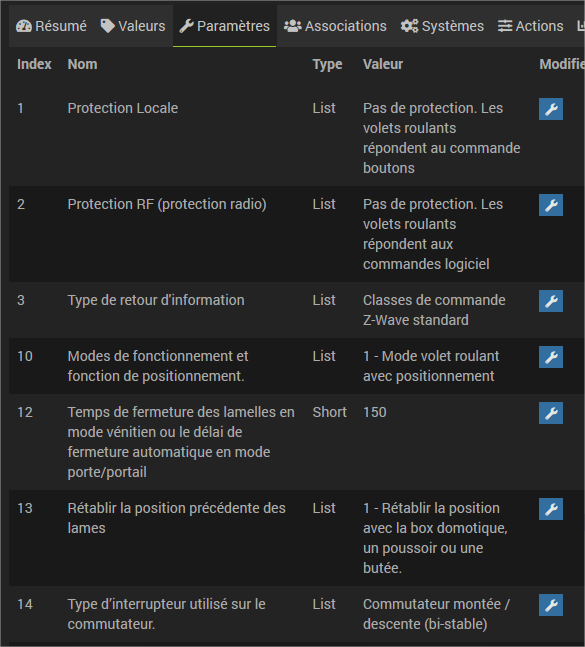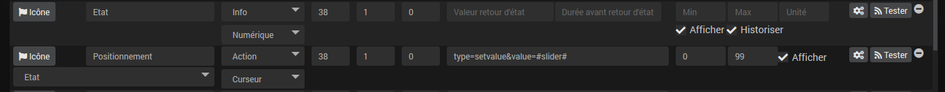 Sur mon dashboard, les fonctions monter/descendre fonctionnent bien soit en cliquant sur les flèches, soit en touchant la barre de positionnement mais les valeurs d’état ne remonte pas. Il y a toujours « 0 » qui s’affiche quelque soit la position du volet. Lorsque je bascule le positionnement à droite par ex, le volet s’ouvre et lorsque je rafraichi la page, le positionnement se remet automatiquement à gauche (position 0) mais le volet lui reste bien ouvert.