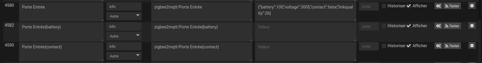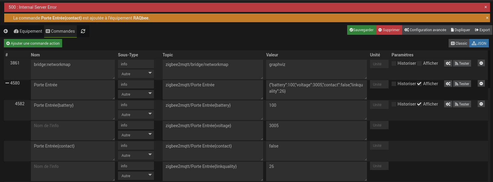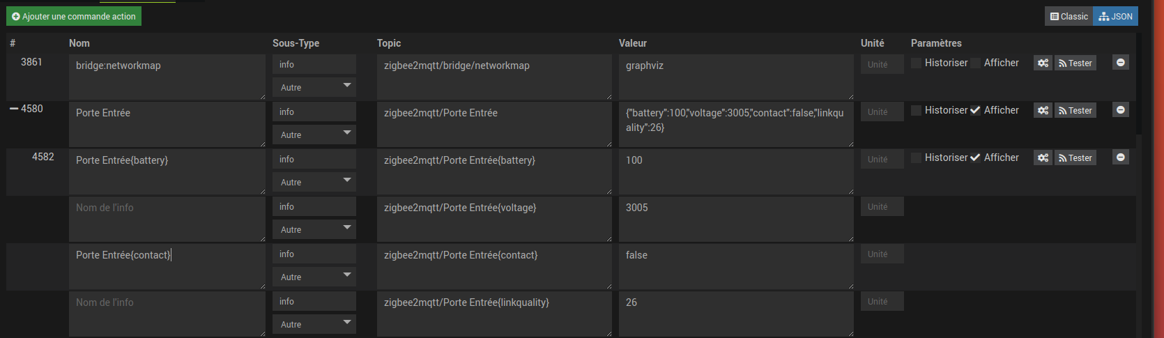 EDIT 3: J’ai renommé mon « Porte Entrée » en « Porte Principale » dans le yaml du zigbee2mqtt + détruit commande et infos dans l’équipement. Le « Porte principale » s’est bien recréé et quand je nomme ses infos elles apparaissent bien dans la vue CLASSIC avec les valeurs associées. Je pense qu’il doit rester un truc en base avec le précédent nom d’équipement…