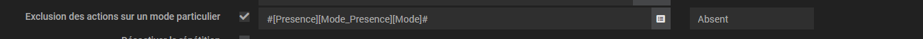 Pour cela j’ai bien spécifié d’exclure les programmateurs lorsque le mode : Absent est activé (mode récupéré depuis le plugin : Mode) hors j’ai encore constaté ce week-end que le mode Absent était bien activé et le programmateur à tout de meme lancé l’allumage des rampes LED :