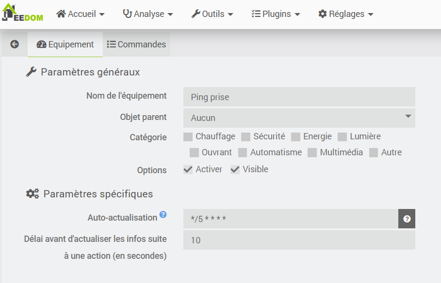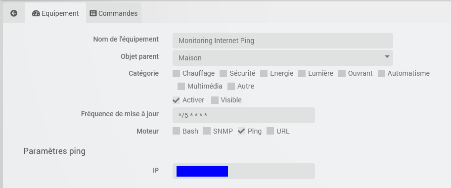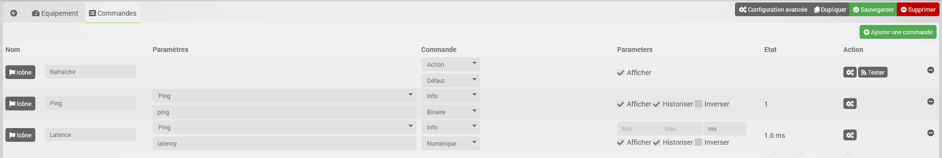 Tu peux paramétrer une ip, une fréquence de mise à jour et une commande binaire qui te dira si ton équipement répond ou pas au ping.