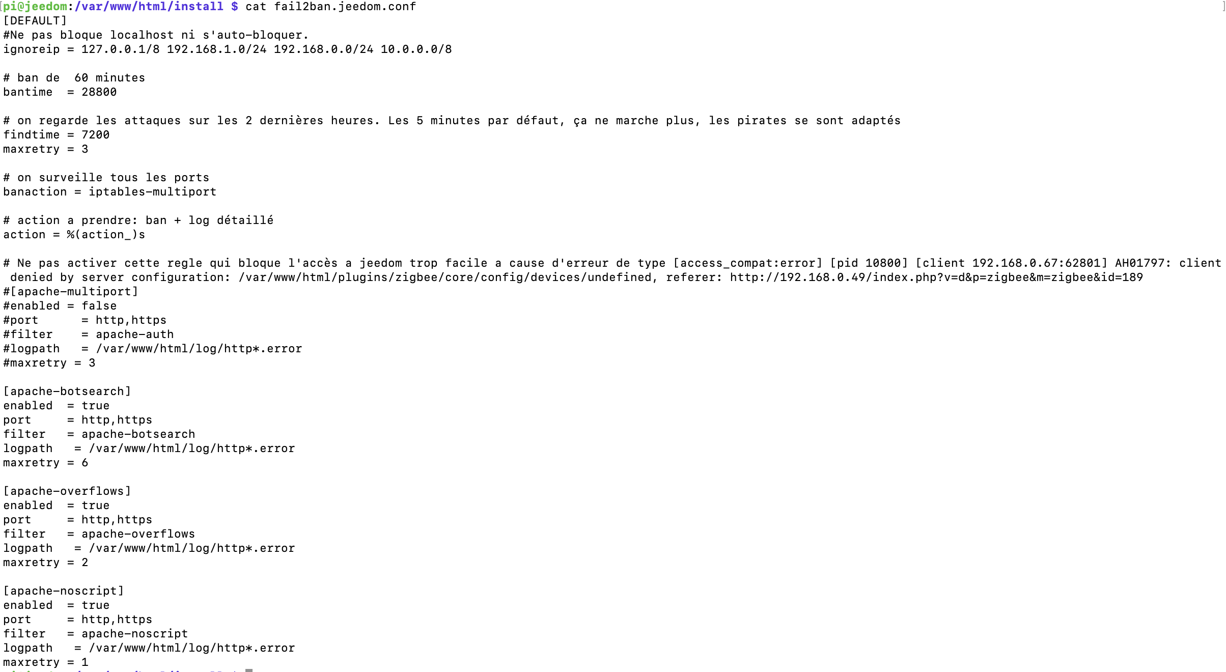 Ma question est: cette procédure est-elle toujours valable. J’imagine que si aujourd’hui ce fichier fail2ban.jeedom.conf existe et a été adapté (désactivation de [apache-multiport] ) c’est qu’il est utile de l’utiliser?