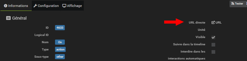 Vous trouverez cette URL dans votre équipement Jeedom, sur l’onglet configuration de la commande, puis informations et enfin URL directe.