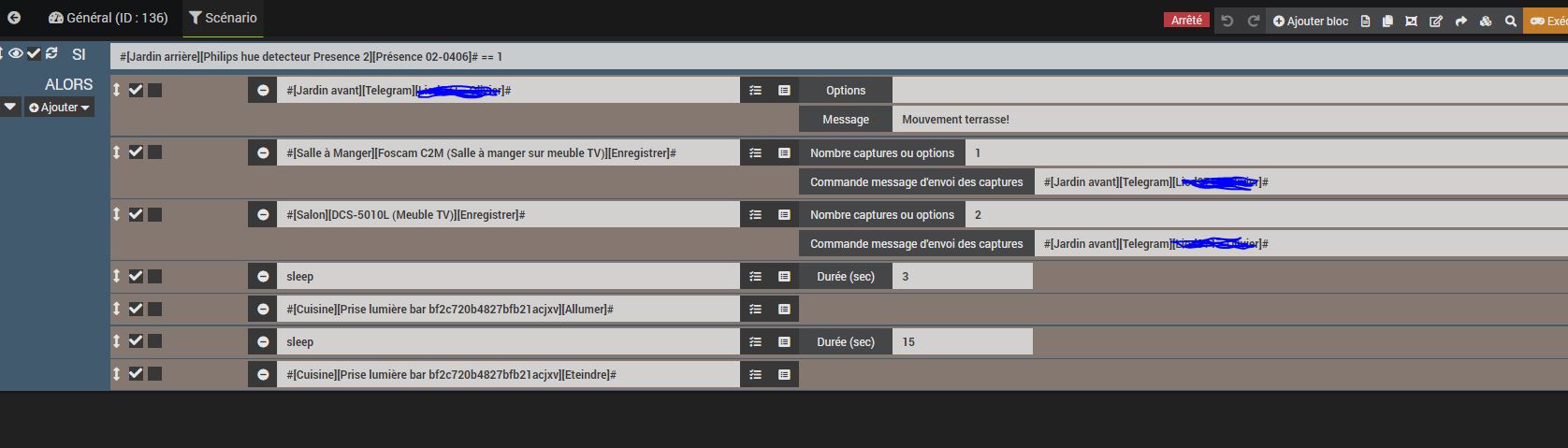 J’ai mis en place un scénario qui se lance en même temps que mon système d’alarme pour détecter une intrusion sur ma terrasse et m’envoyer une photo sur mon portable via Telegram, avant que le voleur ne rentre chez moi par exemple. Le problème c’est que la detection de mouvement est trop sensible du coup quand des piafs passent devant mon détecteur je reçois des photos et notifs ! J’ai regardé un peu dans dans Deconz je ne sais pas où modifier la sensibilité du capteur…