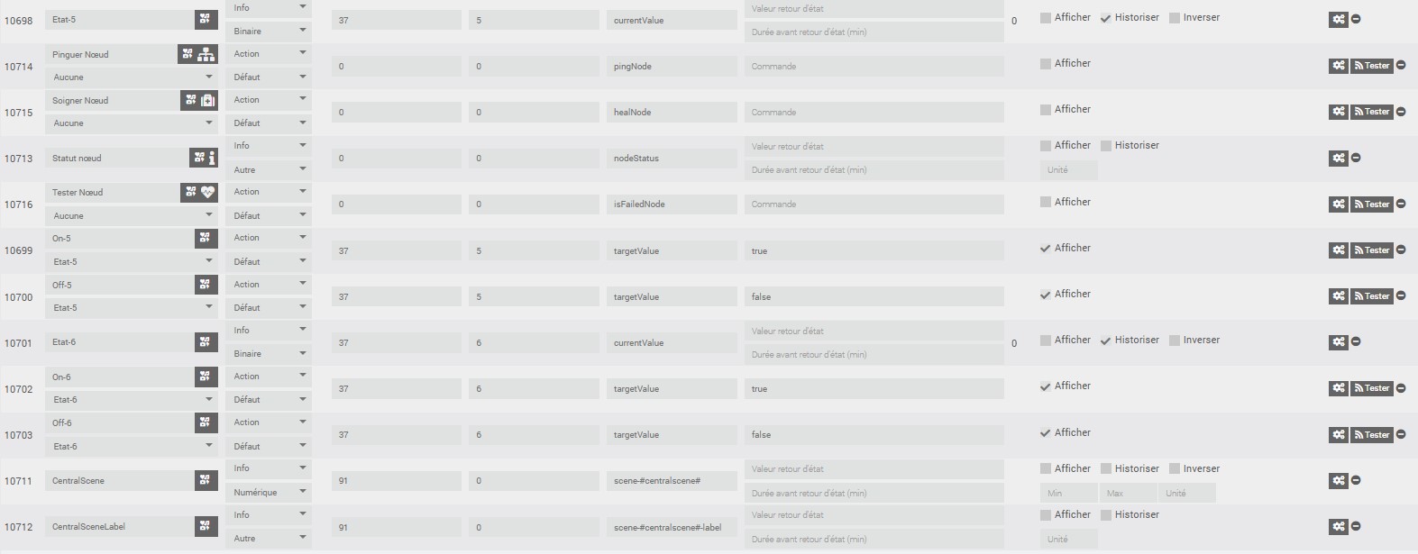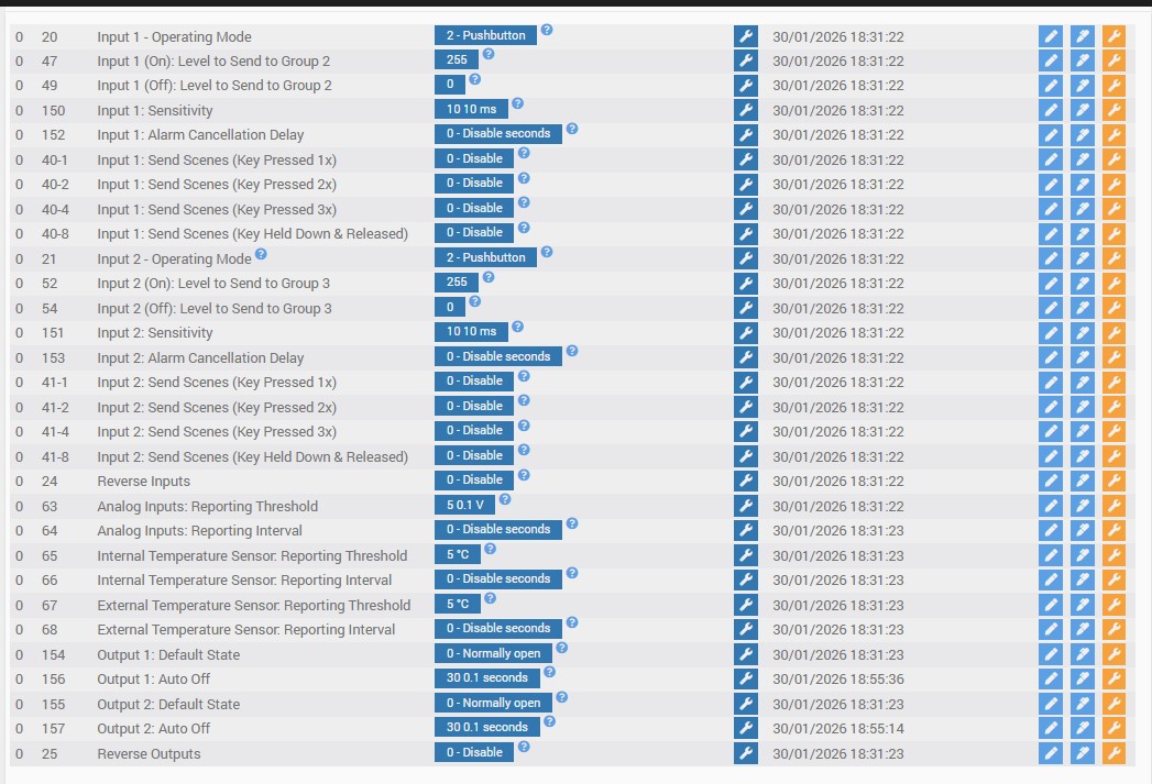 J’ai configuré le 222 en dissociant les in et les out, mis une tempo de 3 secondes (pour essais), les widgets sur mon Dashboard fonctionnent (l’ampoule s’allume puis s’eteint après la tempo), MAIS quand je met mon multimetre sur les sorties, rien ne se passe, le contact reste toujours