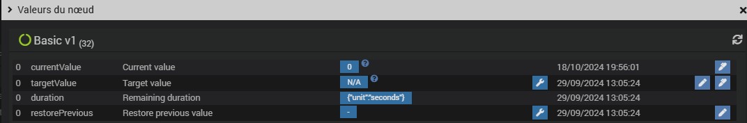 Je regarde les valeurs de noeud et je vois que la valeur current value dans Basic 1 change d’état de 0 à 255 quand il y a une présence.