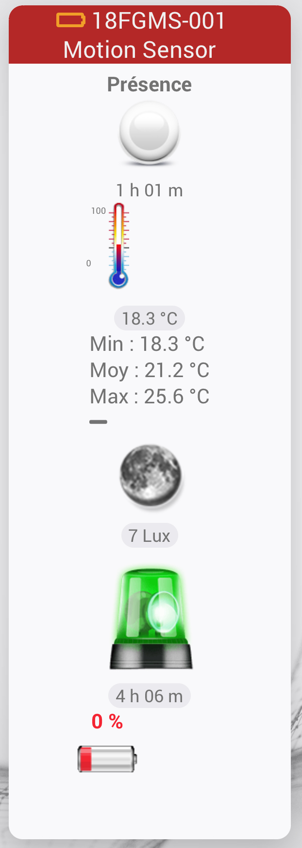 Est-ce qu’il est configuré pour reporter sa température ? Si non, tu peux essayer de le régler pour. Je ne suis pas sûr que la batterie remonte avec la détection. En revanche elle doit remonter avec la température…