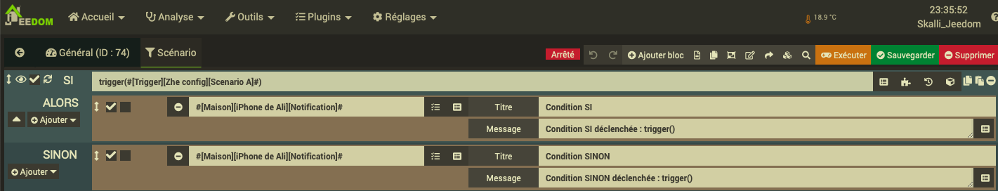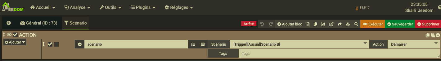 dans le bloc SI de ton scénario B tu oublies la fonction trigger : SI tag(sc) == "A" ALORS Message "Condition SI déclenché par scénario A"