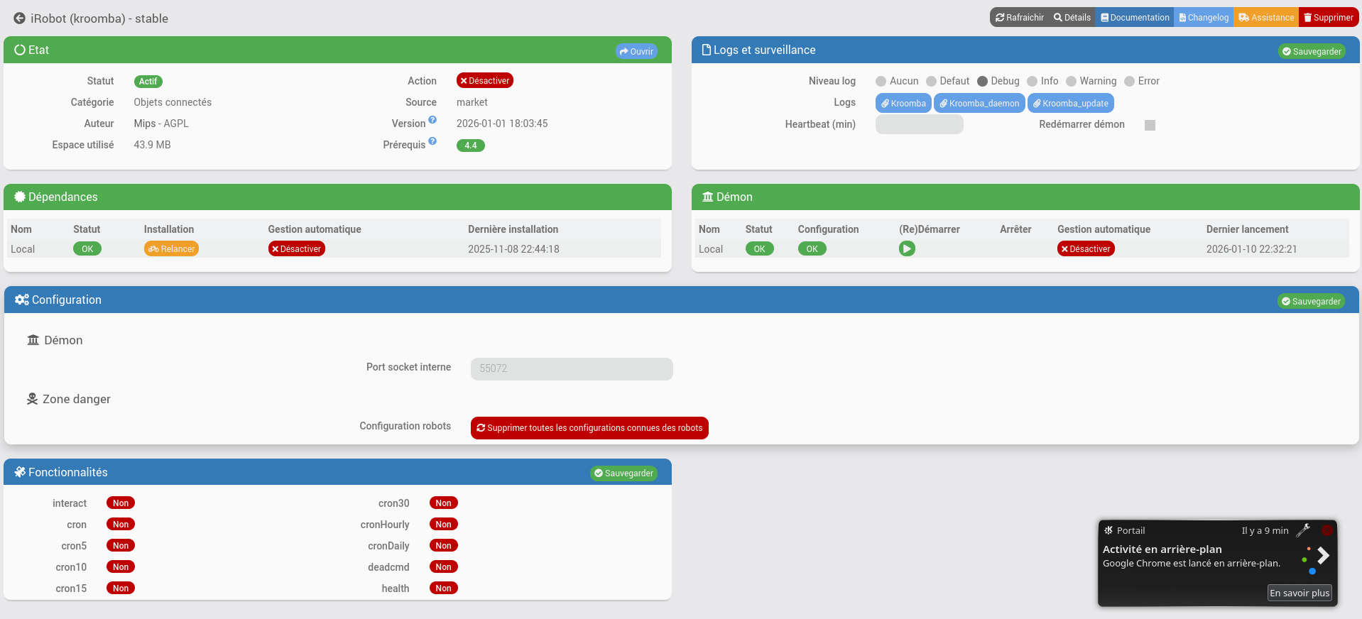j’ai récemment tenté d’ajouter mon robot à Jeedom à l’aide de votre plugin. il semble que la découverte du roomba se déroule correctement mais ensuite, celui ci n’apparaît pas.