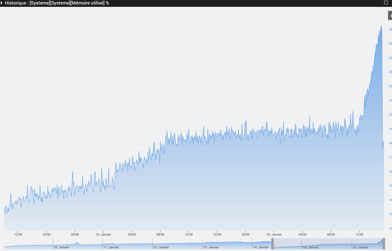 J’ai souvent une augmentation rapide de l’utilisation de la mémoire qui semble provenir du plugin JC. Sur le graphique ici on voit l’évolution de l’utilisation de la mémoire sur les 48 dernières heures, qui monte doucement jusqu’à une augmentation brusque aujourd’hui vers 12h00 qui passe de 19% à 26%. J’ai simplement fait un redémarrage du démon de JC et la mémoire retombe à 18% visible en fin de graphique. J’ai ces augmentations assez régulièrement, presque chaque semaine, mais à des moments et des intervalles qui semblent totalement aléatoires. Je constate également pendant ces périodes d’augmentation que je n’arrive plus à me connecter au plugin avec WS (alors qu’en http ça fonctionne toujours).