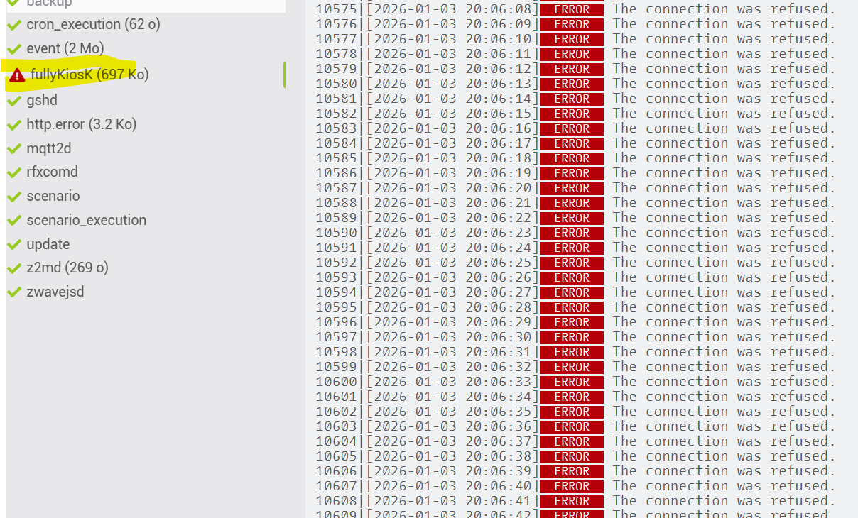 Passe les logs en debug pour avoir plus d’information. Vérifie le compte et le mot de passe de connexion à Fullykiosk sur la tablette