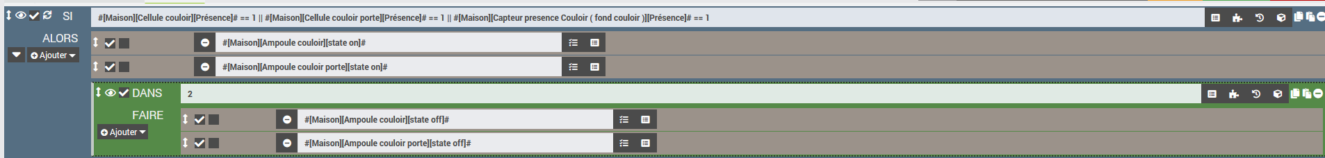 [2024-08-19 17:19:25][SCENARIO] - Exécution du sous-élément de type [condition] : if #[Maison][Cellule couloir][Présence]# == 1 || #[Maison][Cellule couloir porte][Présence]# == 1 || #[Maison][Capteur presence Couloir ( fond couloir )][Présence]# == 1