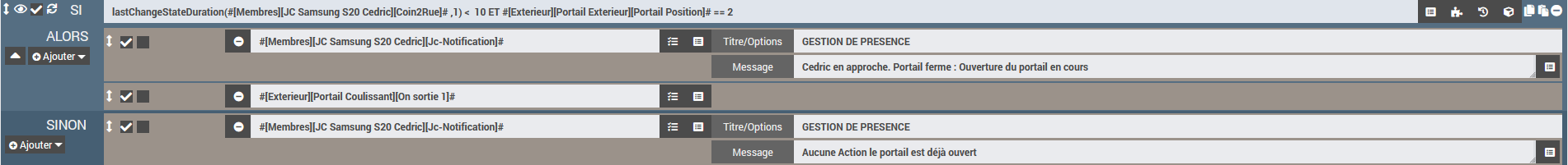 Pour ouvrir le portail, il faut que la zone coin de la rue passe à 1 puis la zone maison (ça évite ainsi les fausses détections de type je vais boire l’apéro chez le voisin)
