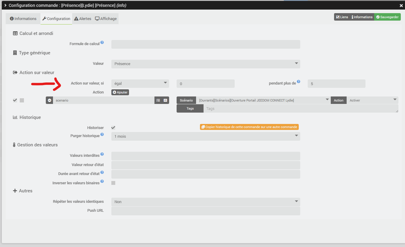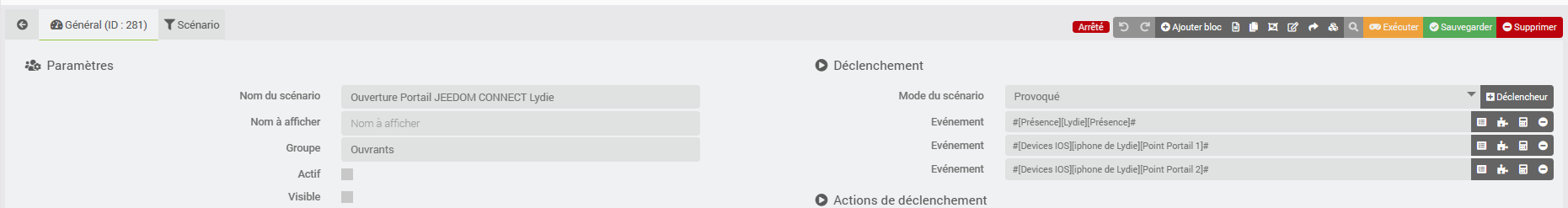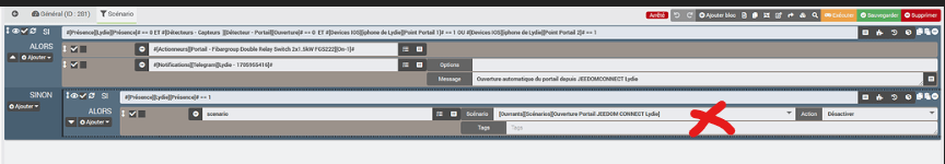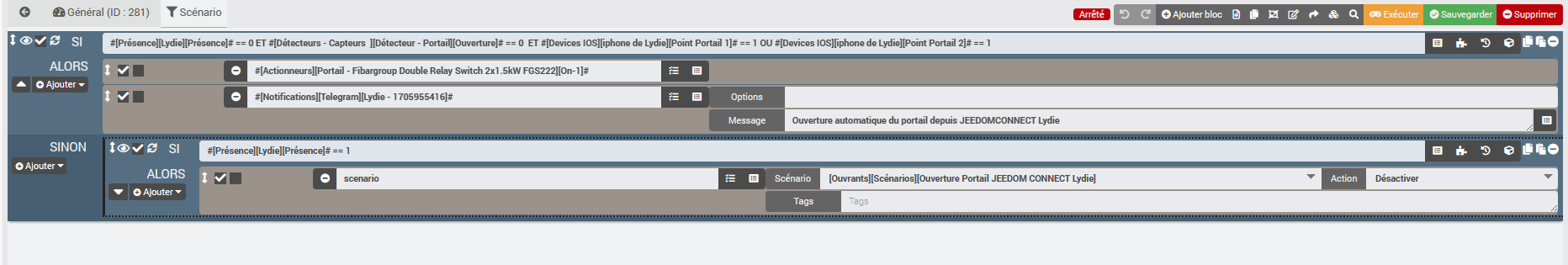 Alors j’ai solutionné l’ouverture de mon portail de la manière suivante avec ce scénario (Prérequis : jeedomconnect (pour le geofencing) et un NUT (pour la gestion de la présence)) :