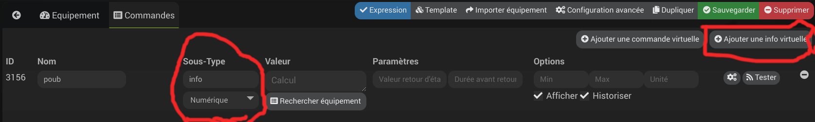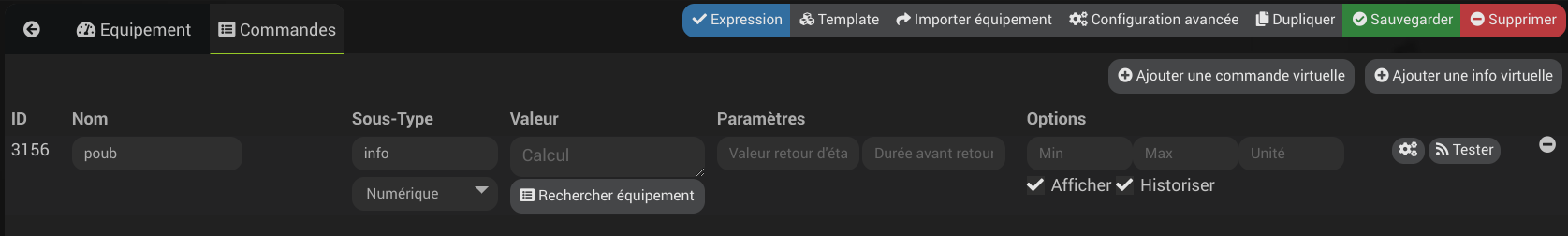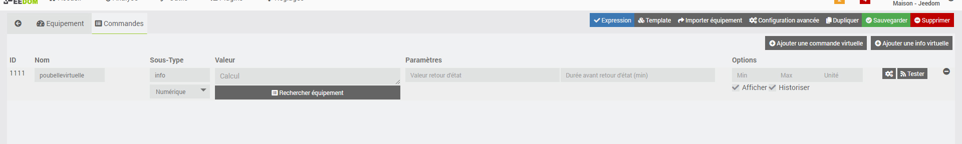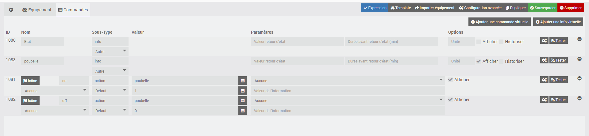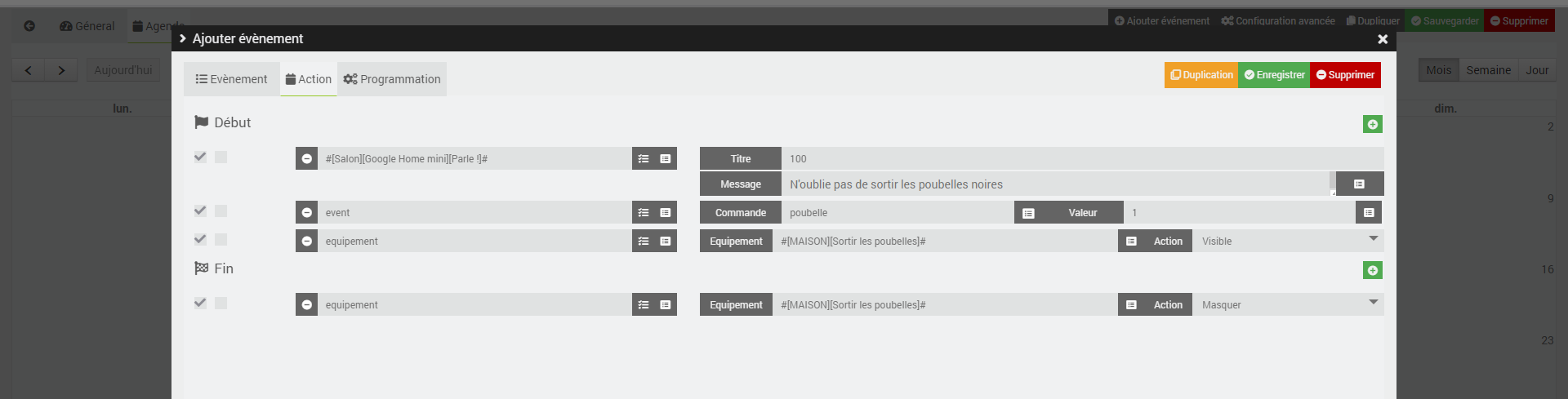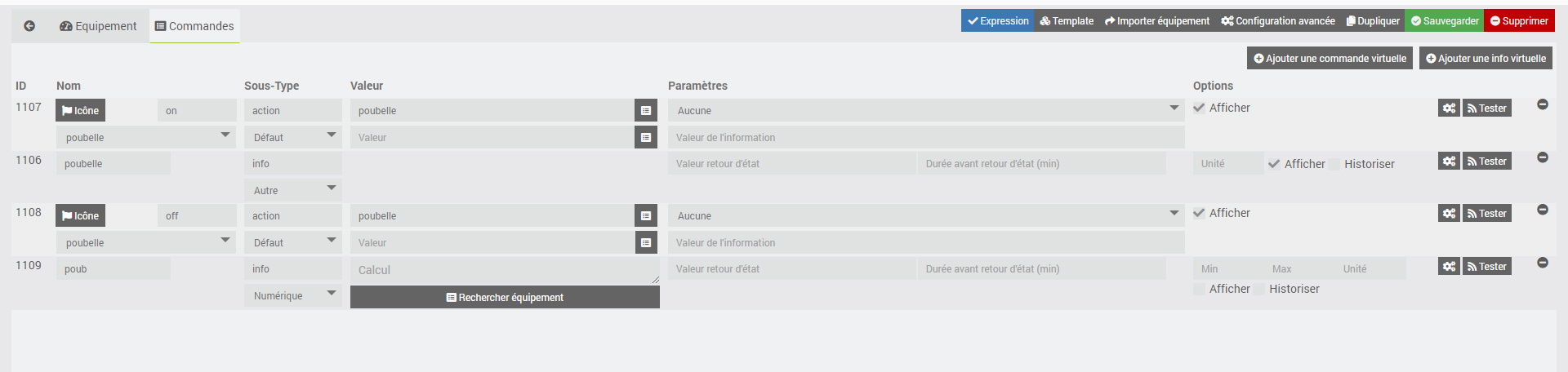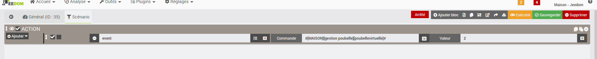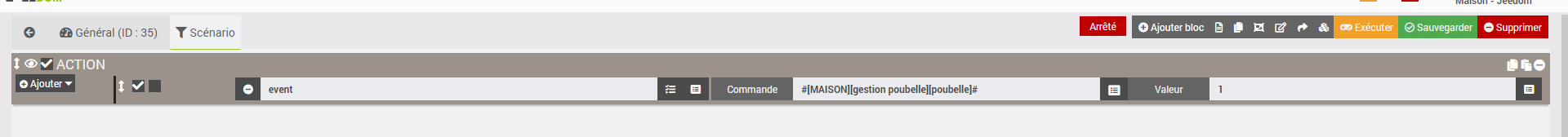 Et si jamais tu préfères cliquer sur les on/off puisque c’est ce que tu fait en cliquant sur ta pouvelle, tu peux le faire également par scénario en sélectionnant les commandes on ou off de l’équipement poubelle.