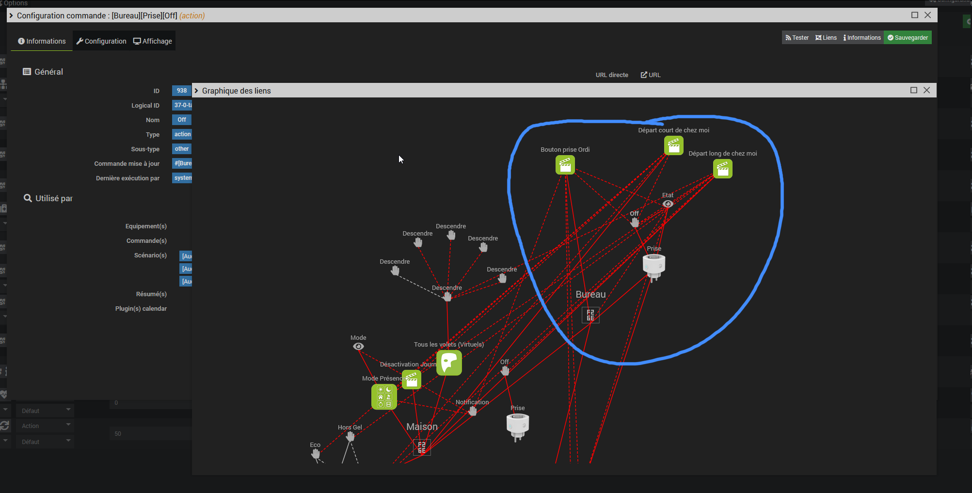 Alors que si je vais dans le graphique de lien côté scénario, on voit que le off de la prise du bureau est utilisé par 3 scénarios : « Bouton prise ordi » comme avant, mais aussi « Départ long de chez moi » et « Départ court de chez moi. » Ce qui est réellement le cas.