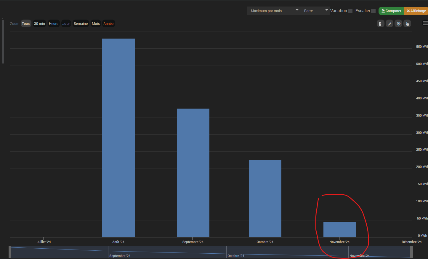 Je tente d’afficher en graphique ma production solaire en comparaison avec ma consommation, mais voici les problèmes rencontrés :