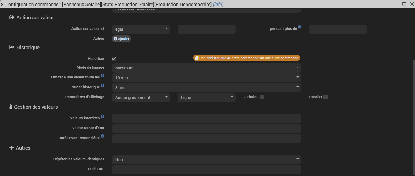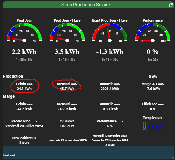 Les données de la production hebdomadaire et mensuelle sont calculées en temps réel à l’aide de ce type de formule. #[Panneaux Solaire][DTU Hoymiles solar][Production Total]#-min(#[Panneaux Solaire][DTU Hoymiles solar][Production Total]#,this week midnight) et historisées avec cette config